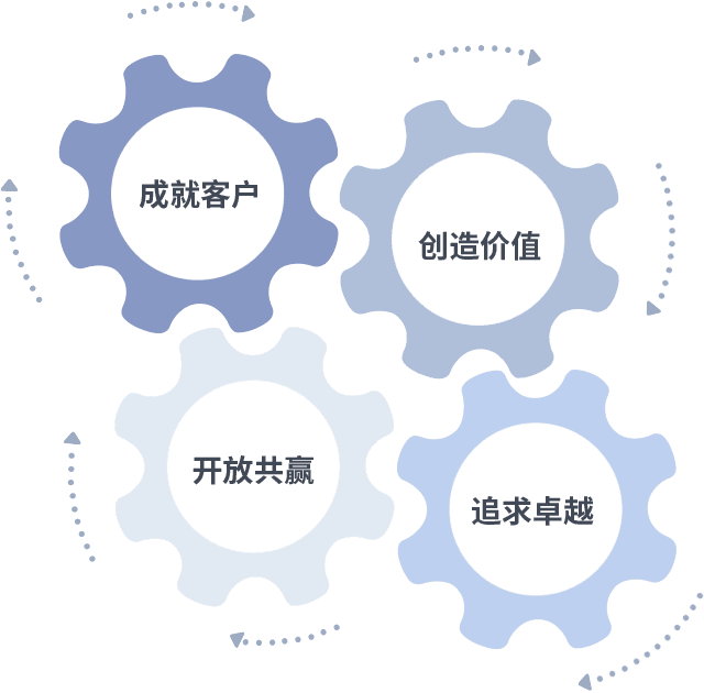 成就客户是一切决策的出发点,,创造价值是衡量所有工作的标准,,,,追求卓越是我们做事做人的态度,,,,开放共赢是我们的格局也是最终的结果。。。价值观的齿轮环环相扣,,推动着组织里的每个人不断向前。。。